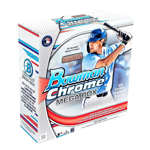 2025 Bowman Chrome Mega Box returns with the top rookies and prospects from 2025 Bowman Chrome Baseball, featured on exclusive Mega Chrome patterns...