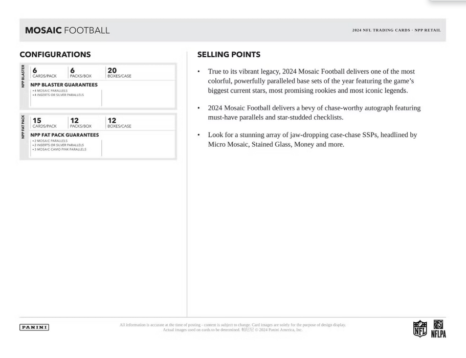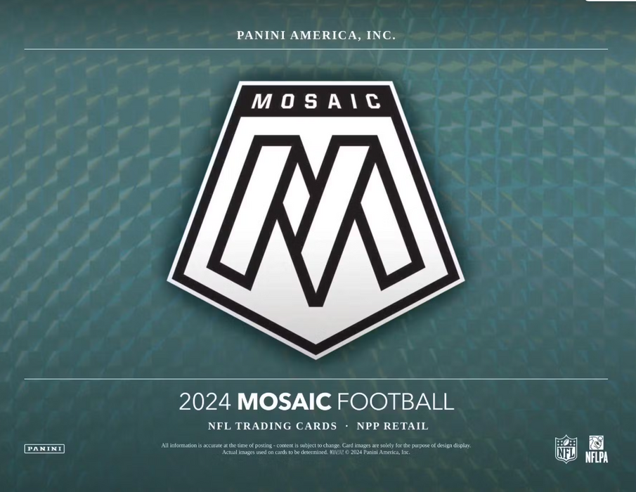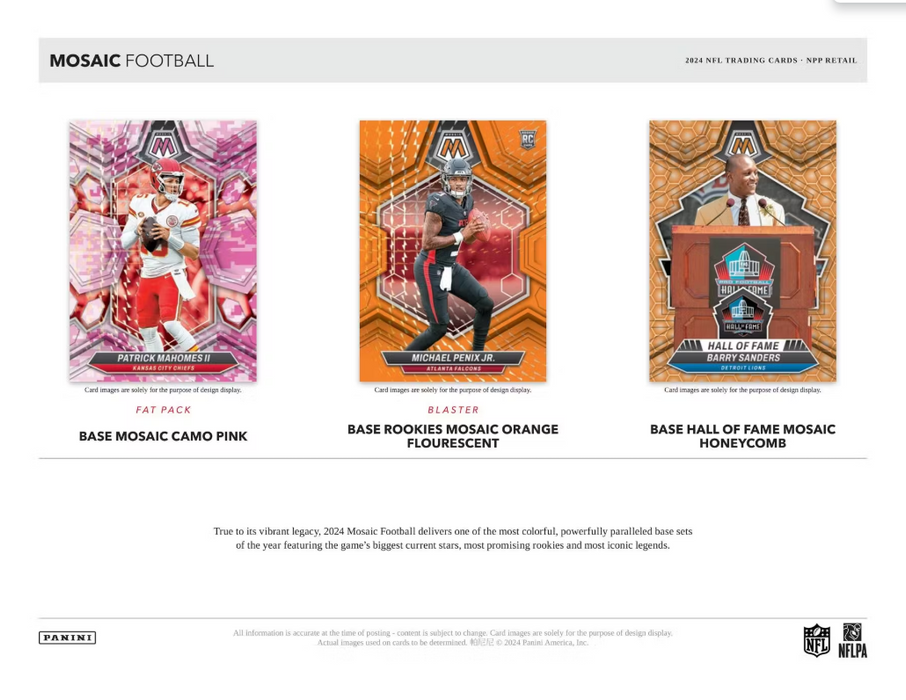 True to its vibrant legacy, 2024 Mosaic Football delivers one of the most colorful, powerfully paralleled base sets of the year featuring the game's biggest current stars, promising rookies, and most iconic legends.